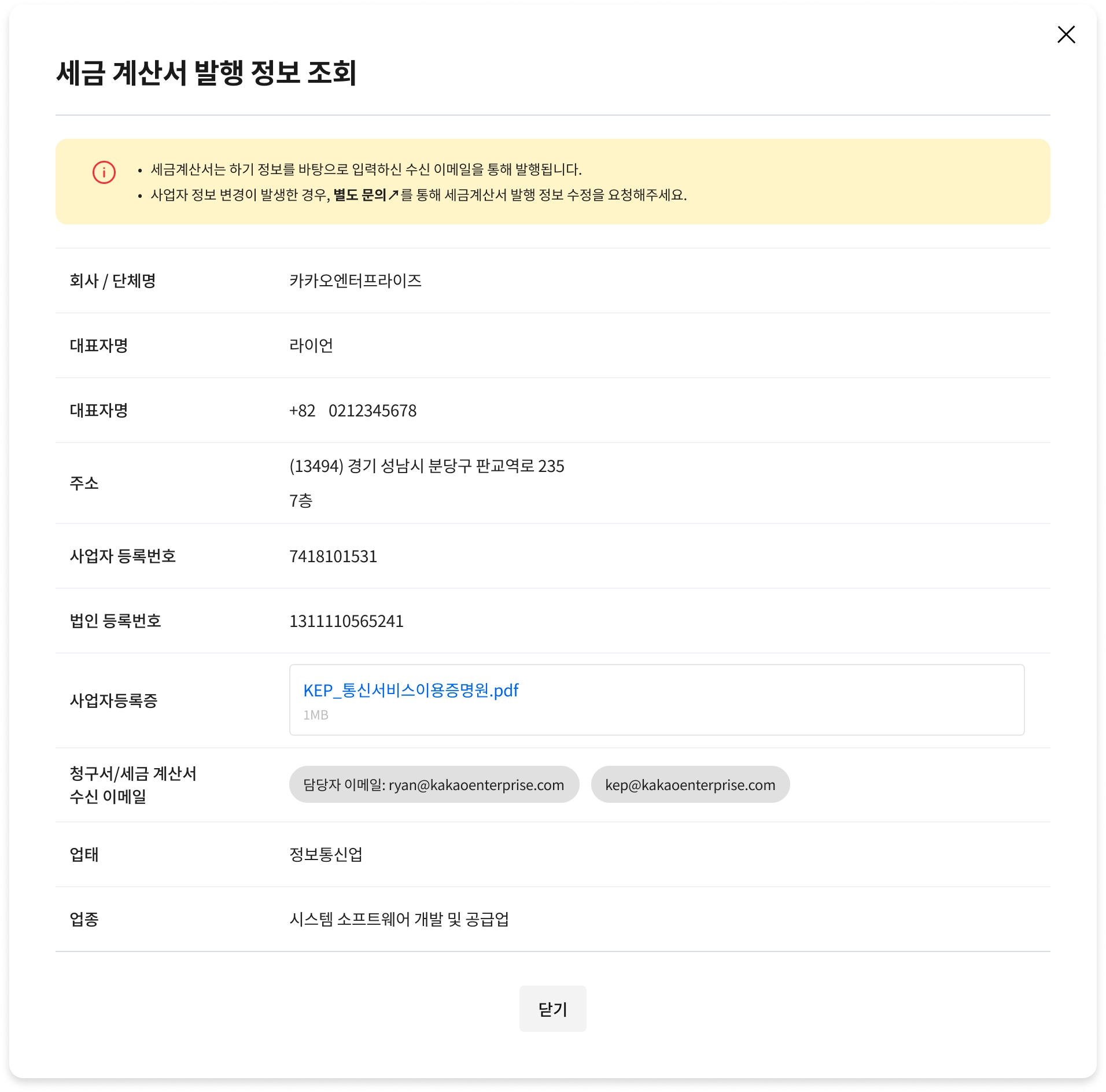 [세금 계산서 발행 정보] 버튼을 클릭하여, 세금 계산서가 발행되는 사업자 정보를 조회할 수 있습니다.