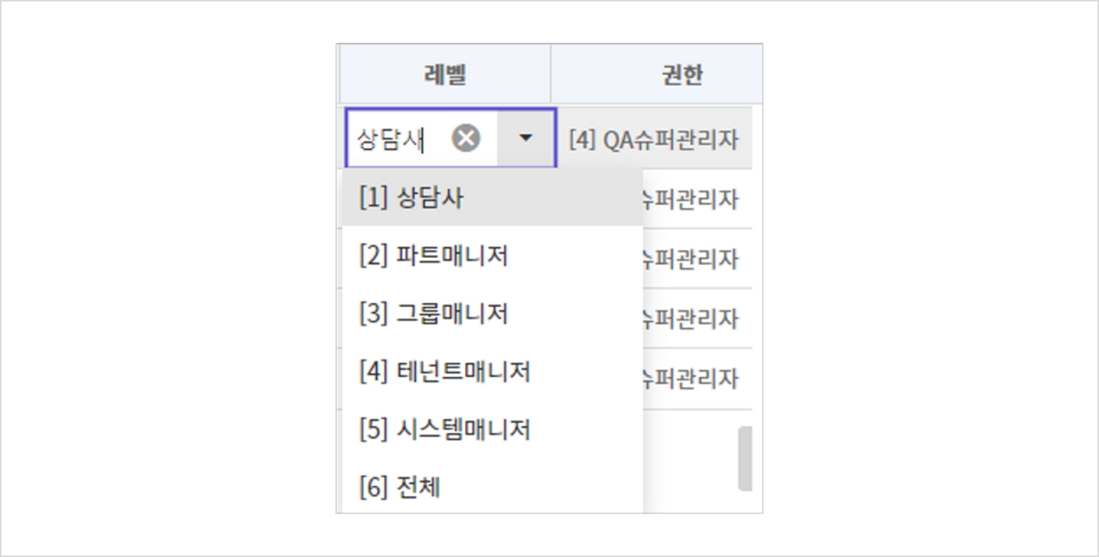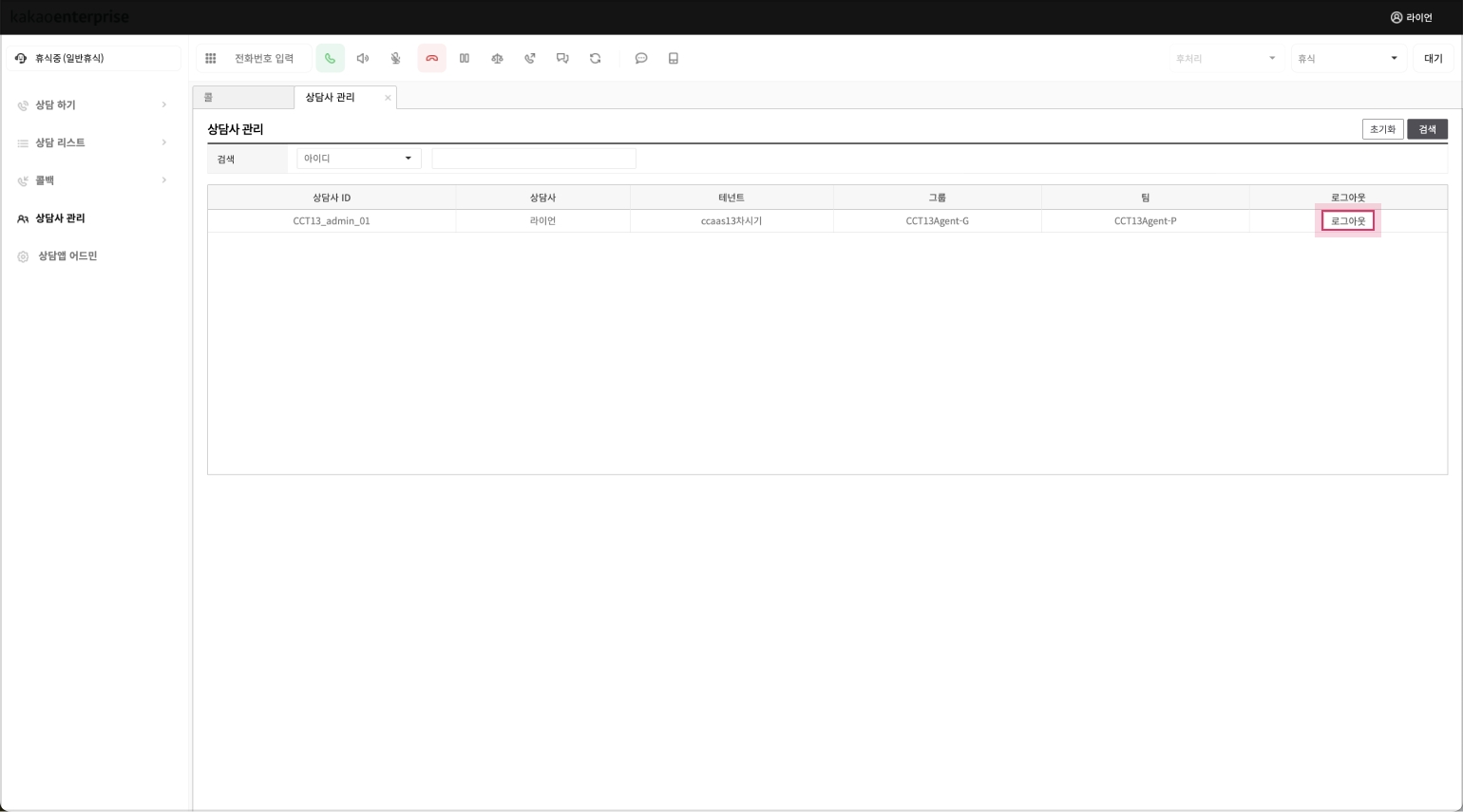 상담 애플리케이션을 사용하기 위한 상담사 계정을 확인하고 제어 기능을 제공합니다. 상담사 레벨이 [1:상담사]로 설정된 경우를 제외하고 사용 가능합니다.