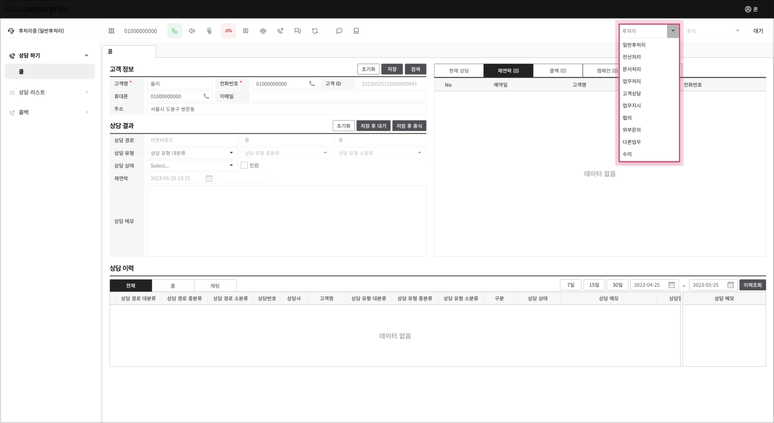 상담 통화를 완료(호 종료)시 상담사 상태는 상담 결과 저장을 위한 “후 처리” 상태로 자동 변경됩니다.