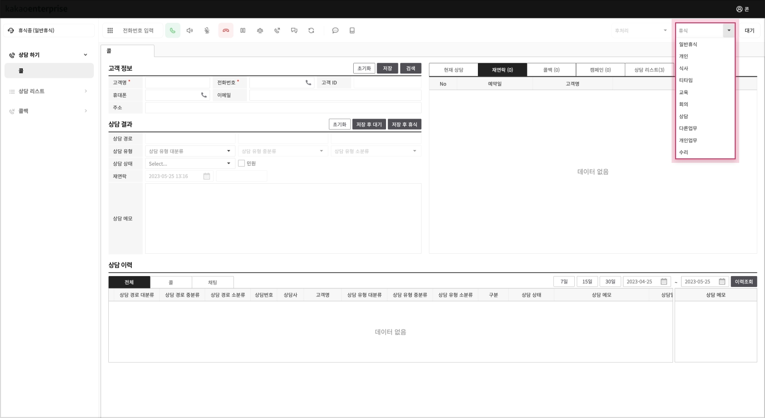 “휴식중”으로 설정된 상태에서는 인바운드 상담호 인입이 되지 않고 아웃바운드 상담호 발신만 가능한 상태가 됩니다.