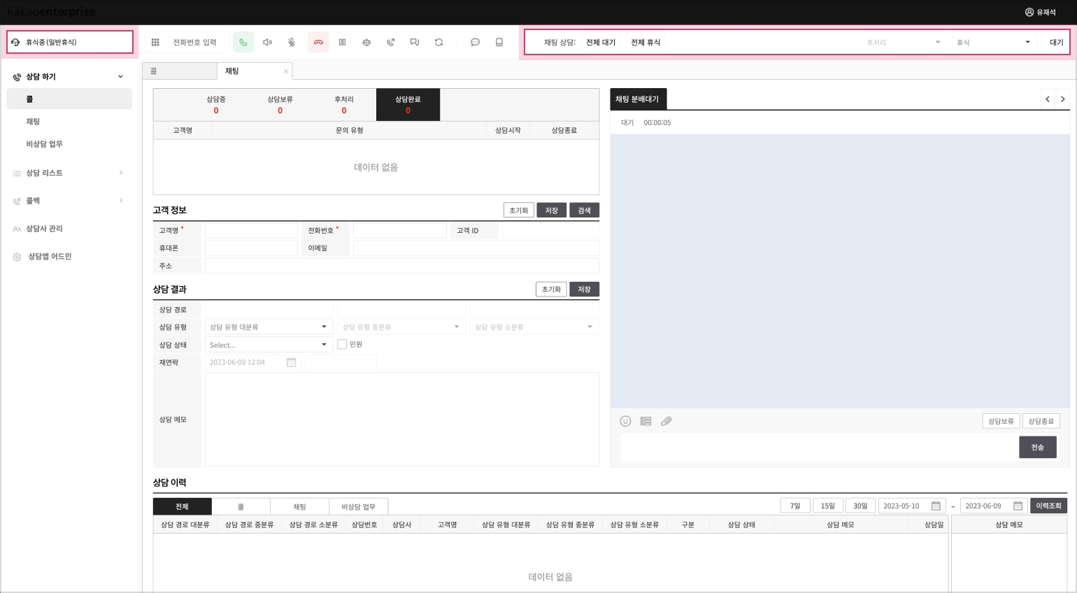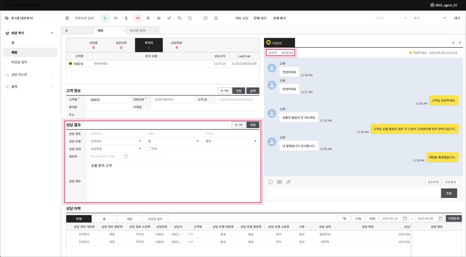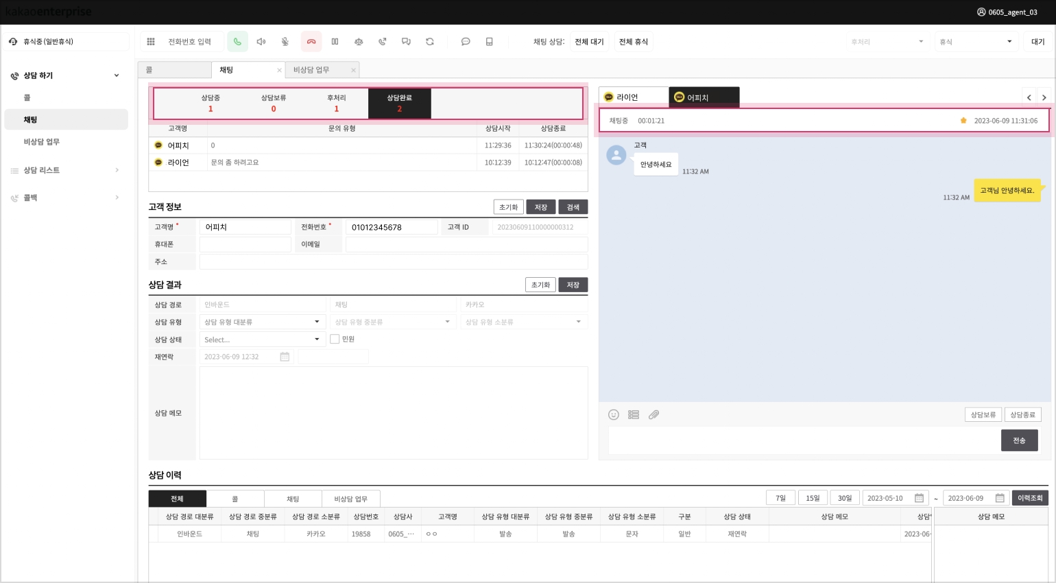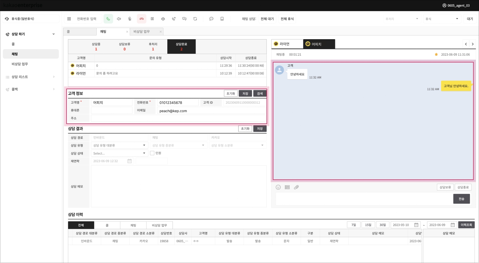 채팅 상담으로 저장한 고객정보나 상담 결과를 콜 상담화면에서도 확인 가능하고, 콜 상담에서 등록한 고객정보나 상담 결과를 채팅 상담화면에서 확인 가능 합니다.